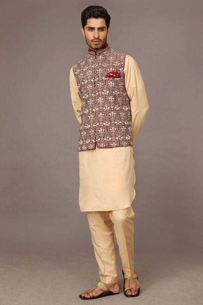 Waistcoats are the perfect add-on over a simple-looking kurta. It sets the right example of the term ‘sophistication.’ Here’s a little secret to nailing this look. Try teaming up a sober kurta with either a printed waistcoat or an elegant Nehru coat. For boys who have less muscular weight, it is advisable to pack the front of the coat to the top for a better look. On the other hand, for a laid-back impression, you can leave the front open.