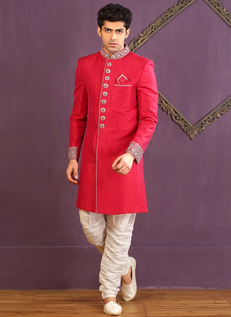 A Sherwani is not only one of the favorite outfits of the Indian grooms that lend you a stylish look. They are designed primarily for special occasions to give you a touch of elegance, class, and style. It proves to be a perfect outfit for a wedding that will surely make you the center of attraction. It is usually teamed with a contrast colored dhoti, churidar or pajama.