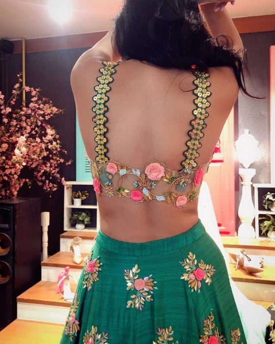 Want to be the trendsetter this wedding season? Make sure that you have this beautiful blouse in your wardrobe. The sequin strap and the floral network on the blouse are definite to steal your heart. The best part: You can match it not only with the saree but also with the lehenga.