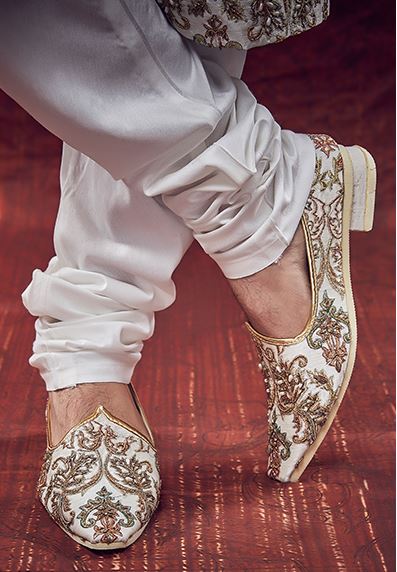 Last but not least, a perfect pair of mojaris is a must-have accessory that every groom should include in his ensemble. It completes the look and adds to the grandeur of your style. A shimmery mojari like this would look great with your ethnic outfit. Replace your regular shoes with something that complements your outfit and the occasion.