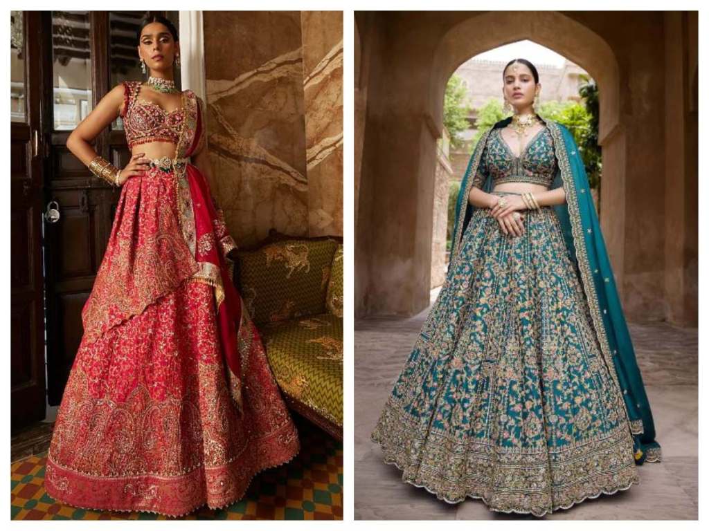 Lehenga silhouettes keep evolving with bridal fashion trends. The classic A-line lehenga with lots of flare is eternally elegant. Mermaid or figure-hugging lehengas are sexy and contemporary. Long flared lehengas with trains create a gorgeous sweep on the floor. Anarkali lehengas have an empire waist and flowy skirt. Mix and match different styles for your wedding functions.