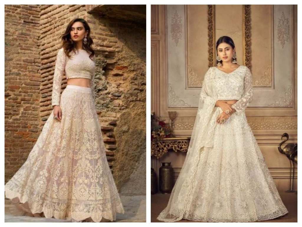 Make a modern statement by pairing a heavy lehenga with a fusion blouse. Choose vibrant shades like fuchsia, emerald or sapphire for the skirt. Contrast it with a bustier-style choli sporting colorful Ari work, cowrie shells or coin embroidery. Finish with a beaded net dupatta for a contemporary twist.