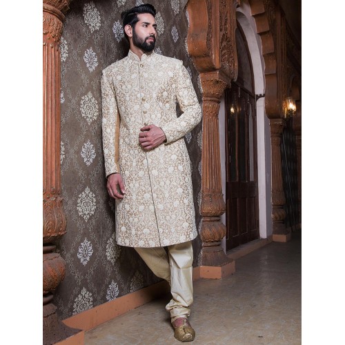 Sherwanis are the most popular garment for Indian grooms; this gorgeous sherwani for Indian men is similar to a long, knee-length coat; sherwani is a trendy and well-known Indian dress; the fabric of this sherwani is sheeny and embroidered. A gathering of pants can be worn with a sherwani. Sherwani represents India’s majestical, traditional, and cultural elements; this civic dress is relatively conventional, but it is also highly fashionable due to the numerous stylish customizations and alterations that may be made to it.