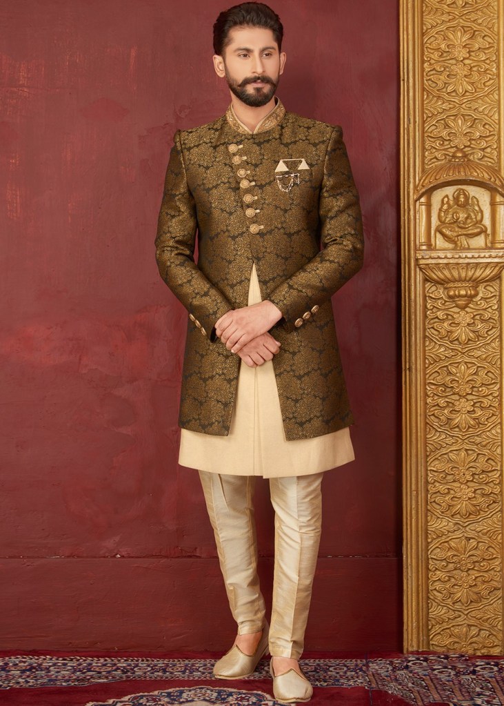Chipkhan style sherwani is majestic; this form of sherwani is beautiful and classy; therefore, if you want to be a sophisticated groom, you should try it out. The renowned Mughal rulers’ wearing style inspired this sort of sherwani. The groom can also add a few sparkles to this look; this look can transform your entire wedding into an unforgettable event, and this type of sherwani is ideal for this magnificent occasion.