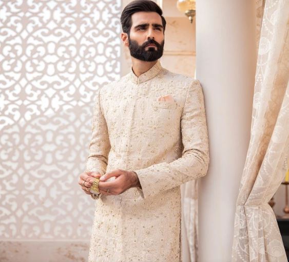Sherwani is a traditional Pakistani dress. The gorgeous Pakistani sherwanis have made their way to Indian weddings, unsurprising. You can’t help but fall in love with this style of Sherwani, which comes in royal colours like navy blue and gold. It has its allure, and anyone who wears it will undoubtedly appear to be a prince.