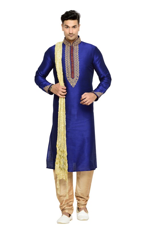 Kurta Pajama for mens during the summer months is usually made of thin silk or cotton fabrics, while in winter kurtas are made of thicker fabric such as wool or “Khadi silk,” or hand-woven silk. In case of occasions, like Bhaiduj, Eid, Durga puja, etc decorative metal buttons, cufflinks, jackets, pocket handkerchief, etc. are fastened with the kurta, to add to the royal look.