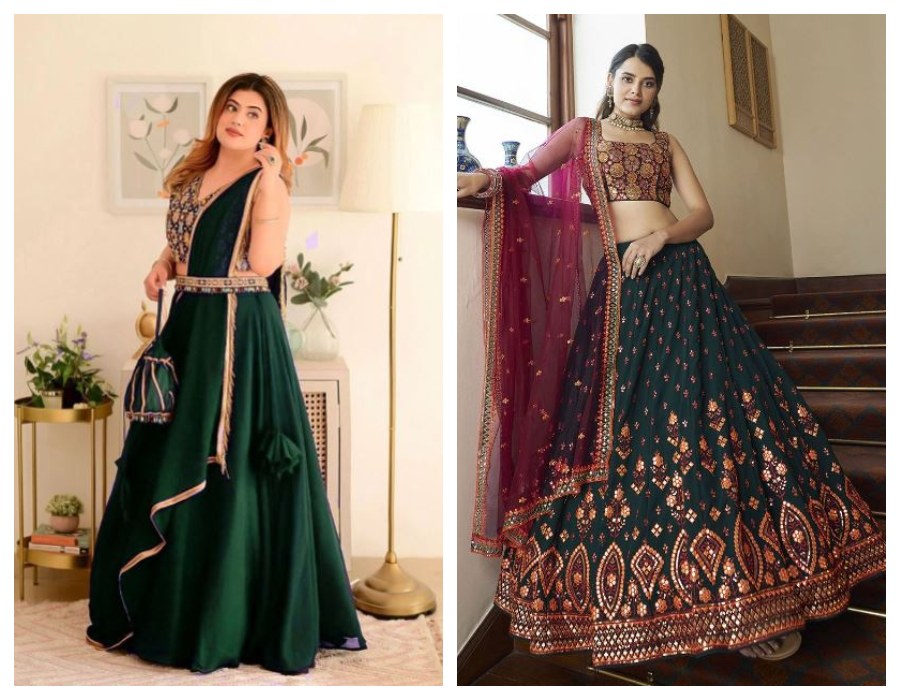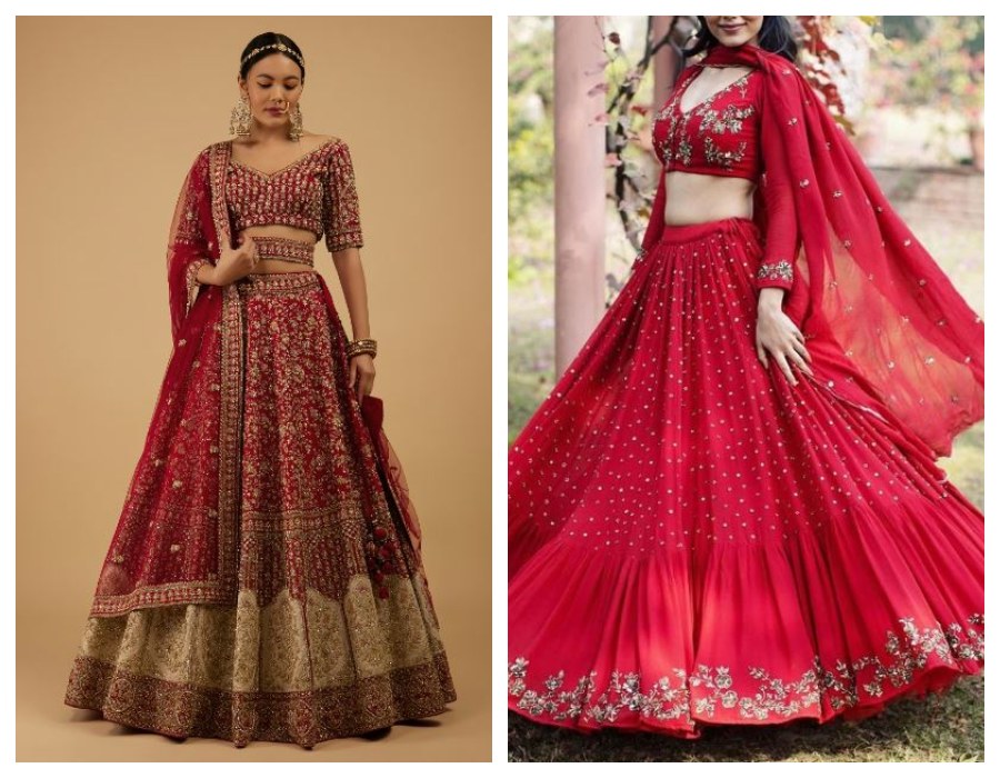 Lehengas also come in modern silhouettes for a fashion-forward look. For example, the mermaid cut lehenga with a sensual fitted shape is very on-trend. It’s often paired with a corset choli for a chic vibe.