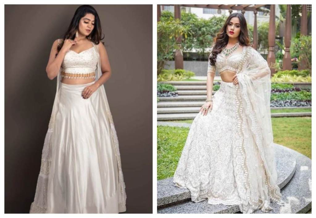 While voluminous skirts never go out of style, brides today love fluid, innovative lehenga shapes. Palazzo pants, dhoti pants, paneled skirts, peplum tops and trailing capes give the white lengha a fashion-forward twist. Light as air chiffon and georgette lehengas have an ethereal effect. Mermaid shapes and flared lehengas look super modish yet traditional.