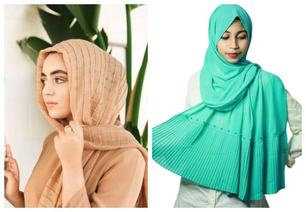For a textured yet tidy look, curl your hair into loose waves first. Gather hair at one side and let the curls fall over one shoulder. Pin the hijab securely on the opposite side with the end flowing down to the shoulders. The contrast of wavy hair and smooth hijab is eye-catching.