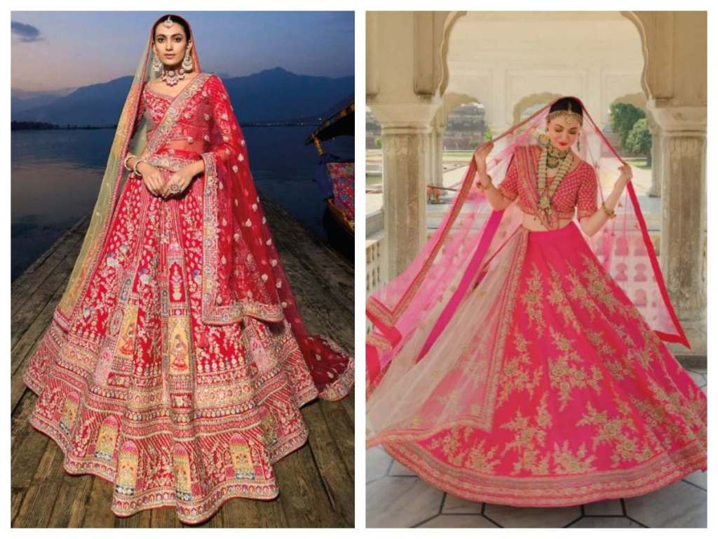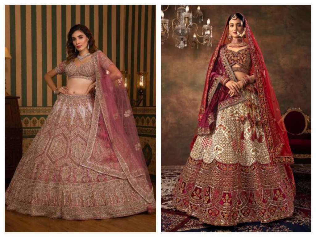 Bridal lehengas are usually made of luxurious fabrics like silk, brocade, velvet, net, etc. Lightweight materials like chiffon and georgette draped in flowing cuts give a romantic vibe. Stiff, heavier fabrics hold the lehenga’s shape better. Prioritize comfort along with richness – avoid overly heavy lehengas if your wedding functions stretch over long hours.