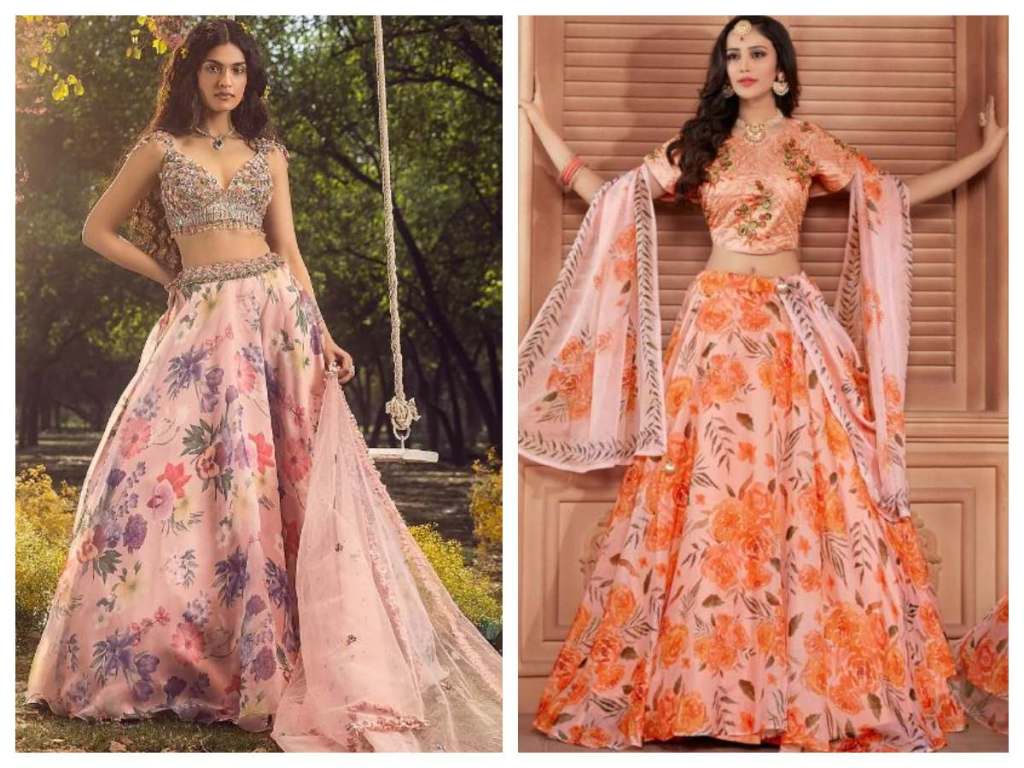 Floral prints whether big or small, minimal or bold never cease to make a style statement. You can opt for flowy georgette or chiffon lehengas with all-over floral prints. They ooze a romantic charm perfect for the pre-wedding celebrations.