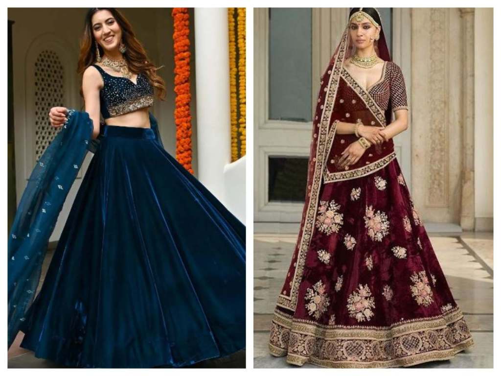 Nothing looks more royal than lenghas made from velvet fabrics. From deep colors like emerald, ruby red color, saphire blue color to pastels colors, velvet fabrics lehengas looks amazing. Pairing them with an embroidery choli will give you a rich look.