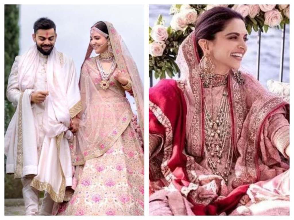 Deepika Padukone’s gold and beige Sabyasachi bridal lehenga is another fine example of the old-world charm of Varanasi silks. The rich zari, badla, marori, and kiran embroidery work on the lehenga skirt elevates its luxurious appeal. Such heavily decked-up bridal lehengas make the perfect pick for grand wedding celebrations.