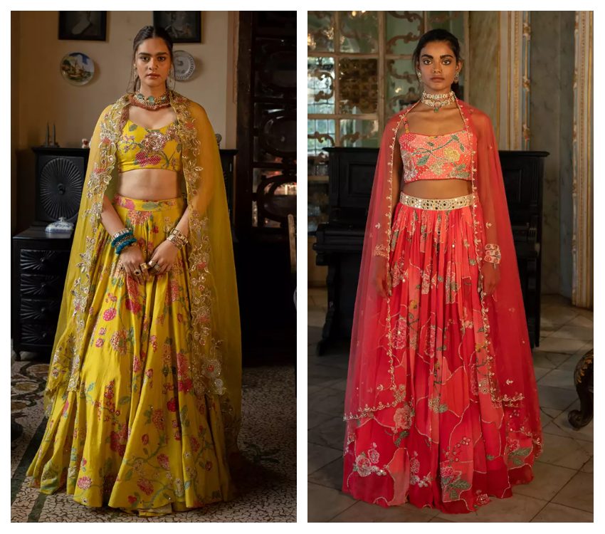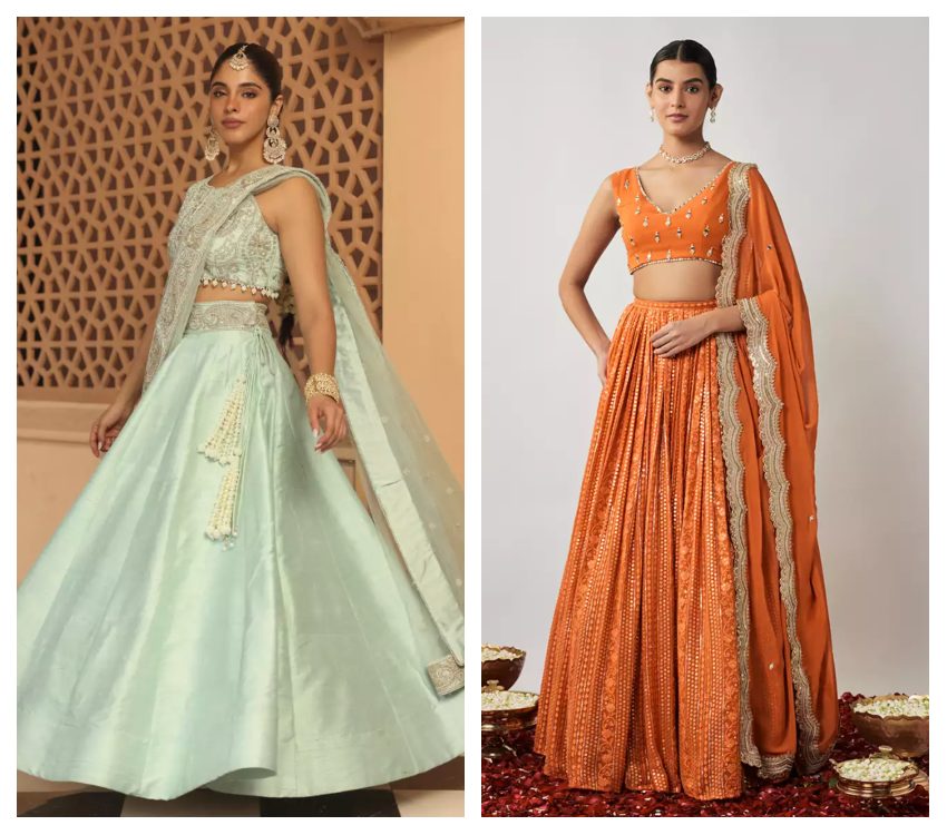 Always focus on your skin undertone, which can be warm or cool. The light color lehenga is for cool undertones, and the bright color lehenga for warm undertone.