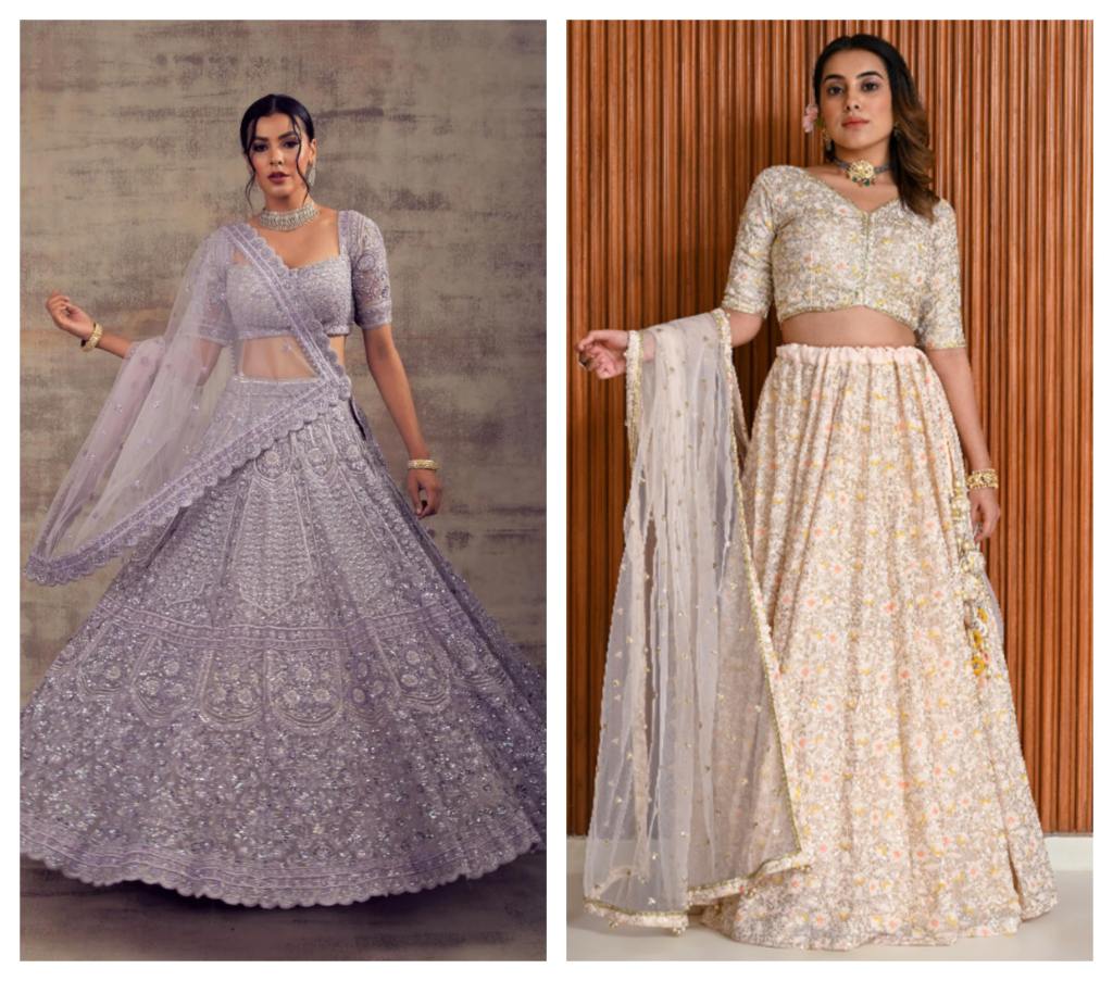 If you prefer soft, romantic vibes, pastel and floral lehengas are the perfect choice. Colors like light blue, lavender, pink, green, yellow lehenga, etc. which are counted under pastel colors are perfect to wear for functions like mehendi, haldi, weddings, festivals, parties, etc. Light colored lehengas made from light fabrics like net, organza, and georgette will make the floral designs look more beautiful.