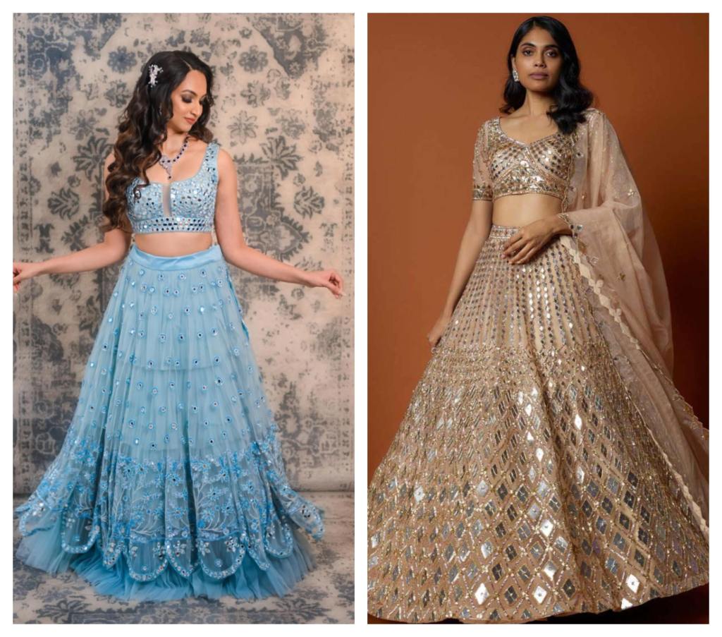 For those who love a touch of sparkle, mirror work and sequins are making a grand comeback. These lehenga with mirror work or sequin work are perfect to wear for festival occasions like Navratri, Diwali or for sangeet and cocktail parties. These lehenga dresses look beautiful under the lights adding sparkle to your look. Sequin lehengas in metallic shades like rose gold, silver, and bronze are trending in the current fashion which makes them perfect for evening events and glamorous parties.