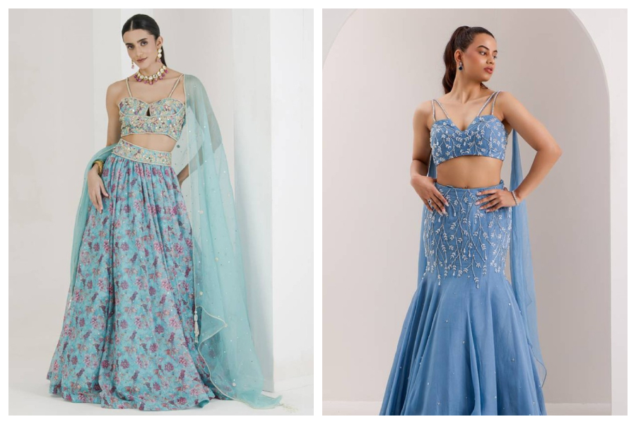 A midnight blue lehenga with gold zari work can create a truly royal look for an evening wedding, a pastel powder blue lehenga is perfect for daytime functions or beach weddings. Each shade tells a different story – royal regality, versus soft romance.