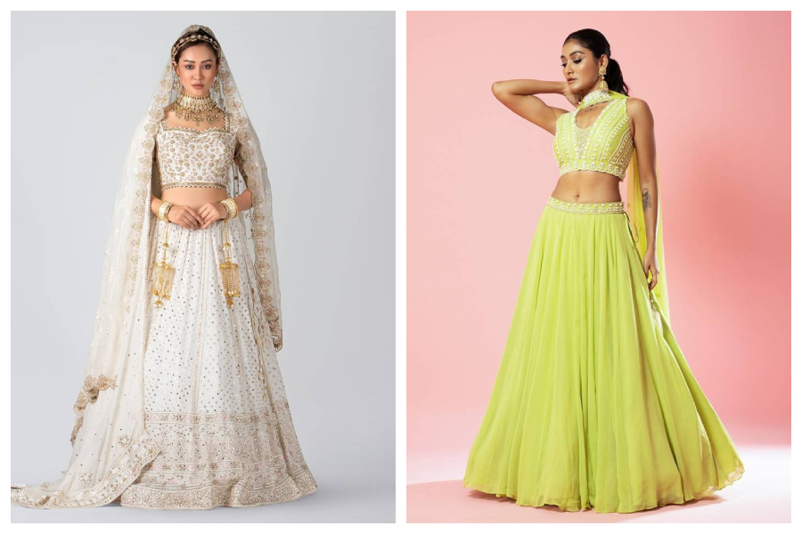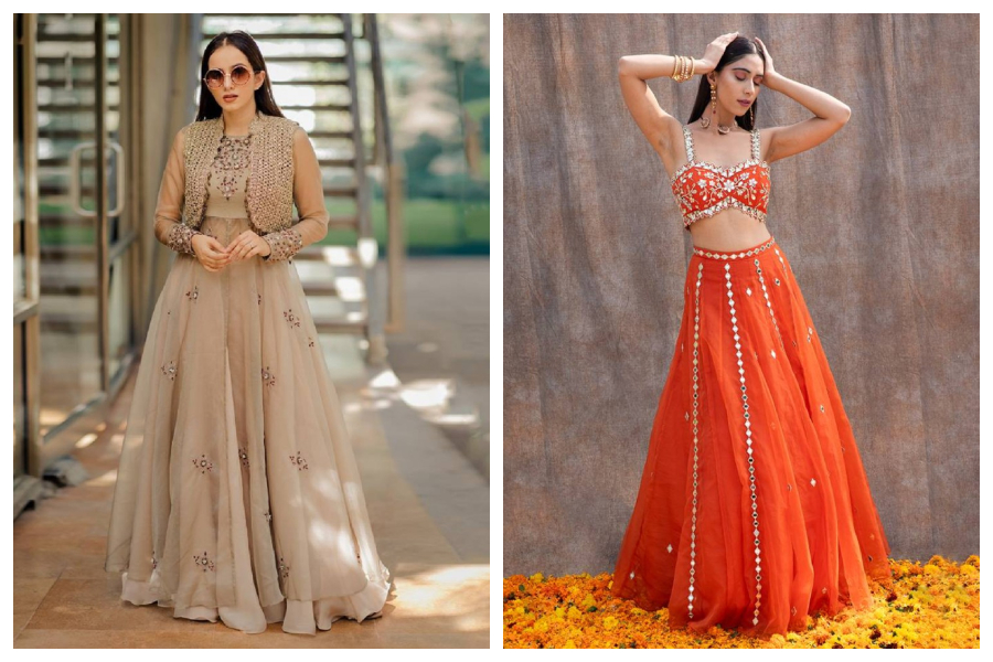 A light, airy organza lehenga that feels festive with digital prints or a light thread work will do the trick while keeping it light and breezy instead of overdone.