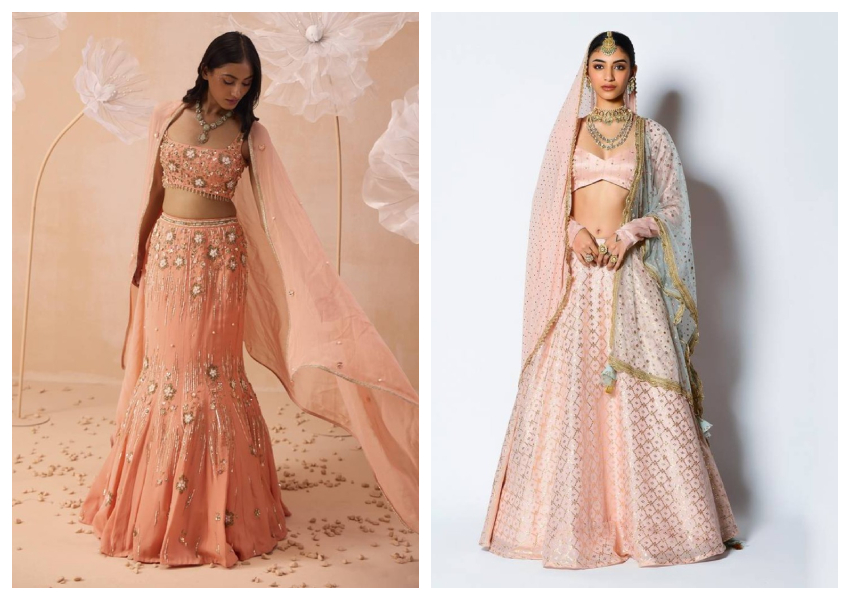 Peach goes with so many themes! Beach weddings of course, intimate garden ceremonies, and lavish indoor wedding celebrations. Whether your wedding is grand or small, wearing a peach lehenga will add an effortless glow to you with style.