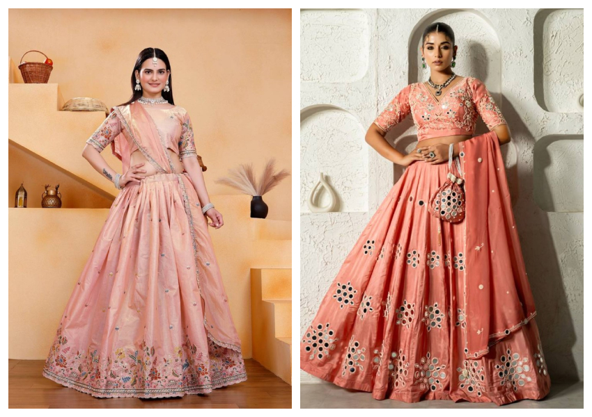 The dupatta: You can wear your peach lehenga with a different colored or textured dupatta. For example, contrasting colors that could pair well with the delicate color of peach could be pale pink, blush, or even soft gold receipts that not only add softness and reflect the elegant softness of peach but also provide an extra layer of dimension to your overall look. A dupatta could be worn in a traditional way across your shoulder, or if you prefer a modern chic look, it could also just be draped down one side.