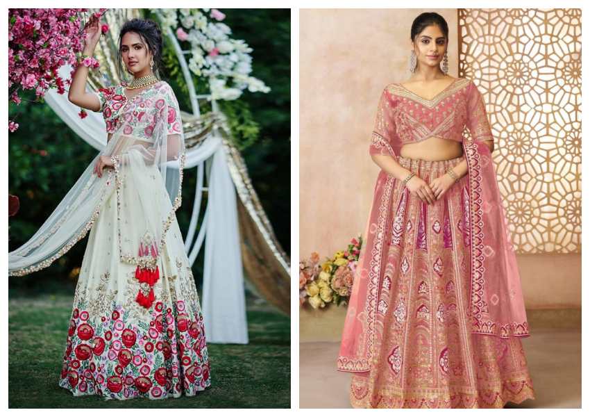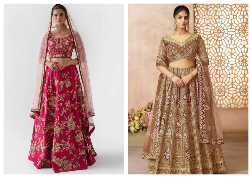 Printed silk lehengas are definitely trending. Digital prints of Mughal art, watercolor floral prints, nature motifs, or abstract designs are now increasingly seen on lightweight silks such as tussar, organza silk and satin silk. These lehengas give a breezy and colorful vibe, and are very appropriate for mehendi, sangeet, or festive occasions. They are also a great option if you want to be stylish without spending a ton of money.