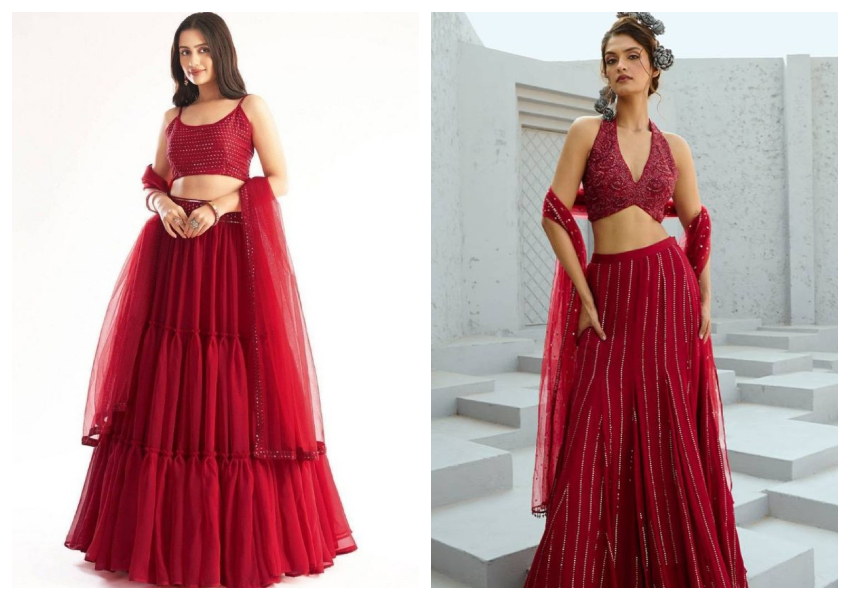 One emerging and dominant niche in the world of red lehengas is the focus on keeping embellishments to a minimum but with bolder statement pieces, like over-sized floral embroidery as an example, sequins, and crystals, which allows the bride to incorporate some glitz and glam of a traditional, we red lehenga while still feeling new and unique. Leaning towards the inscription of the same idea of a fusion lehenga, brides and brides-to-be, are allowing themselves to customize their lehengas, using classic fabrics like silk or velvet combined with contemporary fabrics like satin, georgette, and tulle, it gives the piece an a polished, sophisticated finish.