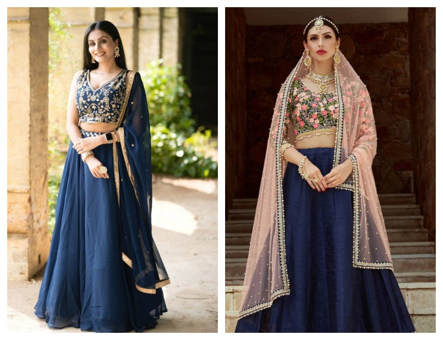 The navy blue lehenga can be enhanced through the type of blouse worn with it. Matching a navy blouse to the lehenga creates a streamlined and sophisticated style, while contrasting blouses in gold, ivory, blush pink, and emerald green can create a visually appealing design. There has been a movement towards modern blouse styles such as off-shoulder, deep V, corset-style, and cape blouses and these types of blouses pair well with navy lehengas. If the bride desires a classic look, then she may choose to wear a full-sleeve ornate blouse for her navy lehenga.