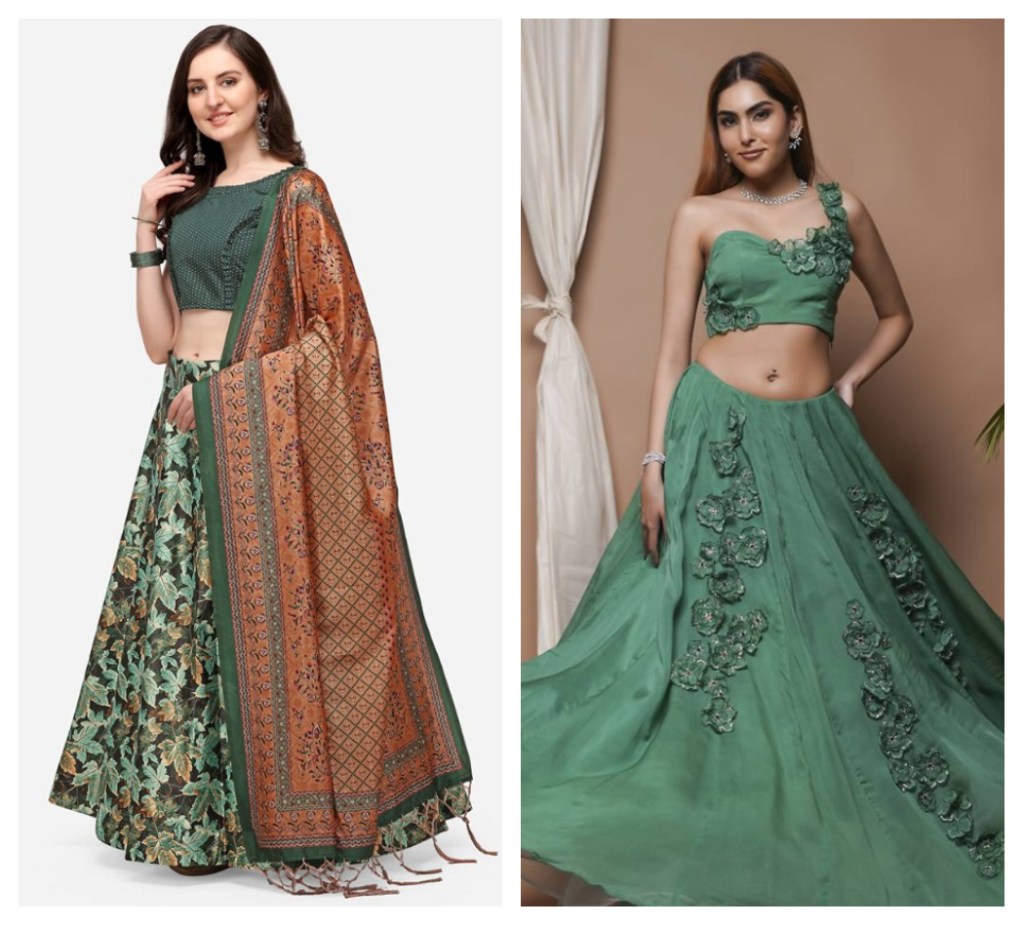 Many of today’s weddings are themed roughly on a combination of themes for instance, ceremony location, wedding venue (garden wedding, palace wedding, mandap/temple beach wedding, destination/intimate wedding) will all be incorporated into one wedding ceremony. Green lehenga (a type of traditional Indian garment) would fit aesthetically into most of these types of ceremonies as well as complement some of the decoration/themes used at those ceremonies. Photographers will take advantage of using this unique color for their photography since green color will show up nicely both in daylight and nighttime photographs. So green will provide a very nice alternative to the more traditional saturated (red) colors.