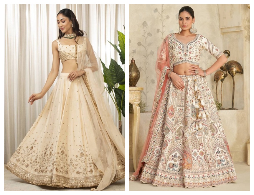 When it comes to seeing a cream lehenga set in pictures or in person, fabric is the most important part of how the look comes together. For daytime ceremonies, lightweight materials like georgette, organza, and net have lots of movement and softness. These fabrics also complement floral embroidery, thread work, or very subtle sequins.
