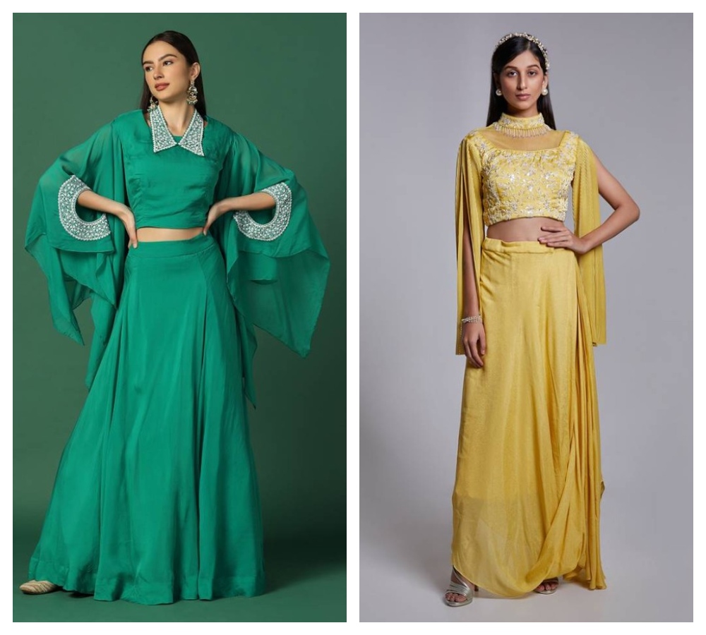 Outdoor celebrations during Mehendi / Sangeet celebrations can be long, especially in the summer months. To cater to this, a number of designers are now using lightweight fabric materials like georgette, chiffon, crepe, and lightweight silk blends to create crop top lehengas. All of these fabric types give you the ability to move freely while also keeping the overall volume and flowing characteristics associated with traditional-style lehenga skirts. Multiple layers of fabric at the hem, along with the use of soft lining as an underlining, can provide comfort without sacrificing the overall construction of your outfit. Fashion is defined by practical elegance in 2026, therefore, lightweight crop top lehengas are a perfect choice to go along with the relaxed but fun atmosphere of these events.