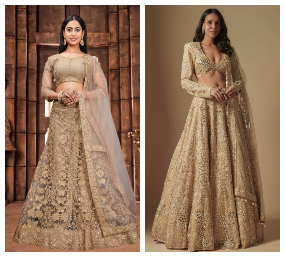 The rise in the popularity of rose gold as one of the popular metallic shades has added a new dimension to bridal fashion choices. The use of rose gold embroidery on a beige lehenga set creates a relaxed, modern atmosphere. The simple use of the very light pink undertones will add warm color and contrast without becoming an overpowering highlight, making this color combination a great choice for daytime weddings or pastel-themed decor. Delicate floral prints are often used with rose gold thread embroidery and are accented with sequins and white beads, giving the wedding dress feminine elegance. Soft glamour makeup with nude lips and dewy skin complement this color combination perfectly and tie the overall appearance of the bride together in a cohesive manner. Modern brides looking for elegance that is a little outside of the box frequently turn to rose gold as a design choice because it provides both sophistication and something new.