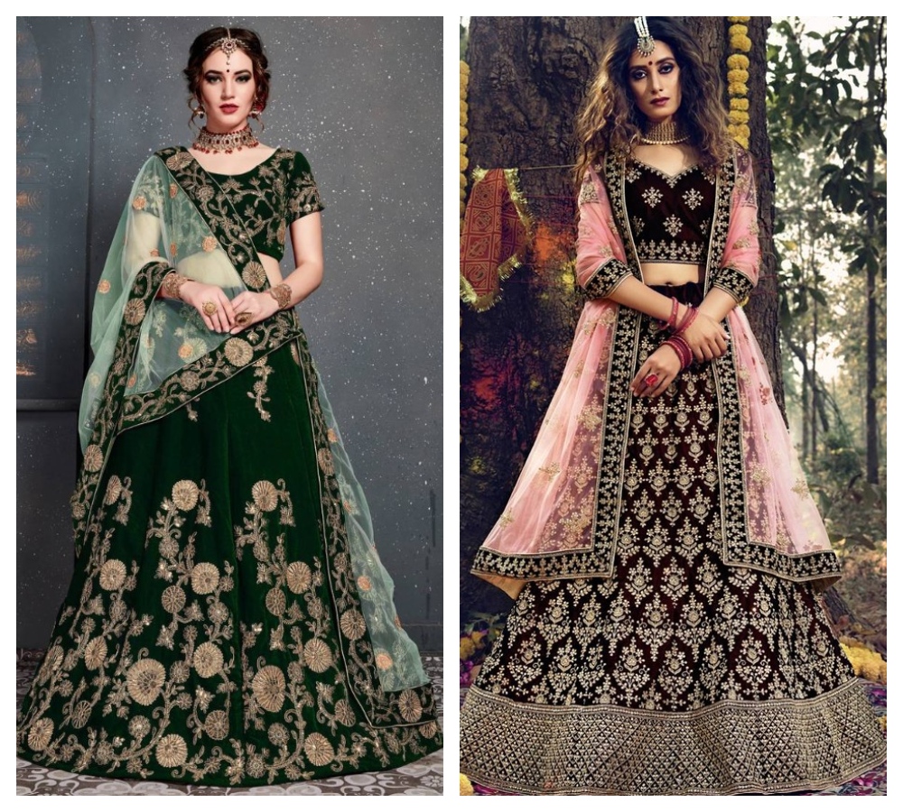 Dark velvet lehengas have a rich and dramatic presence. Bridal dresses in darker shades (deep burgundy / midnight blue / emerald green / plum / maroon / black) are generally used during the evening and winter seasons. The element of rich coloration enhances the inherent luster of velvet fabric and gives it a jewel-like glow under artificial lighting. Dark velvet lehenga sets typically look fantastic with heavy embroidery, gold/silver zari work and traditional embellishments (i.e., stone and bead work), thus creating an overall grand appearance. Brides who wish to stand out; create a lasting impression; wear dark velvet lehenga; since these garments will make an attention-grabbing statement while also conforming to the traditional aesthetics of bridal wear but still appear luxurious and contemporary.