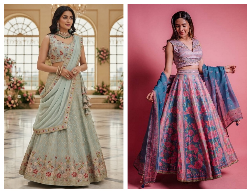 The intimate wedding experience focuses on the quality of connections, relaxed spaces, and authentic expressions of love between partners. Floral lehengas created for these occasions are typically soft pastel colors, lightweight fabrics such as organza, chiffon or georgette, and subtle prints. The textural nature of these designs gives brides a simple and elegant appearance that does not overshadow either the bride or the location. Brides wear subtle hand-painted floral designs, little embroidery, and breathable silhouettes as an emphasis on comfort during the ceremony. Some brides wear outfits that tell their story (e.g., using their favorite flower, using colors with symbolic meaning, or creating custom designs) to create a truly unique experience.